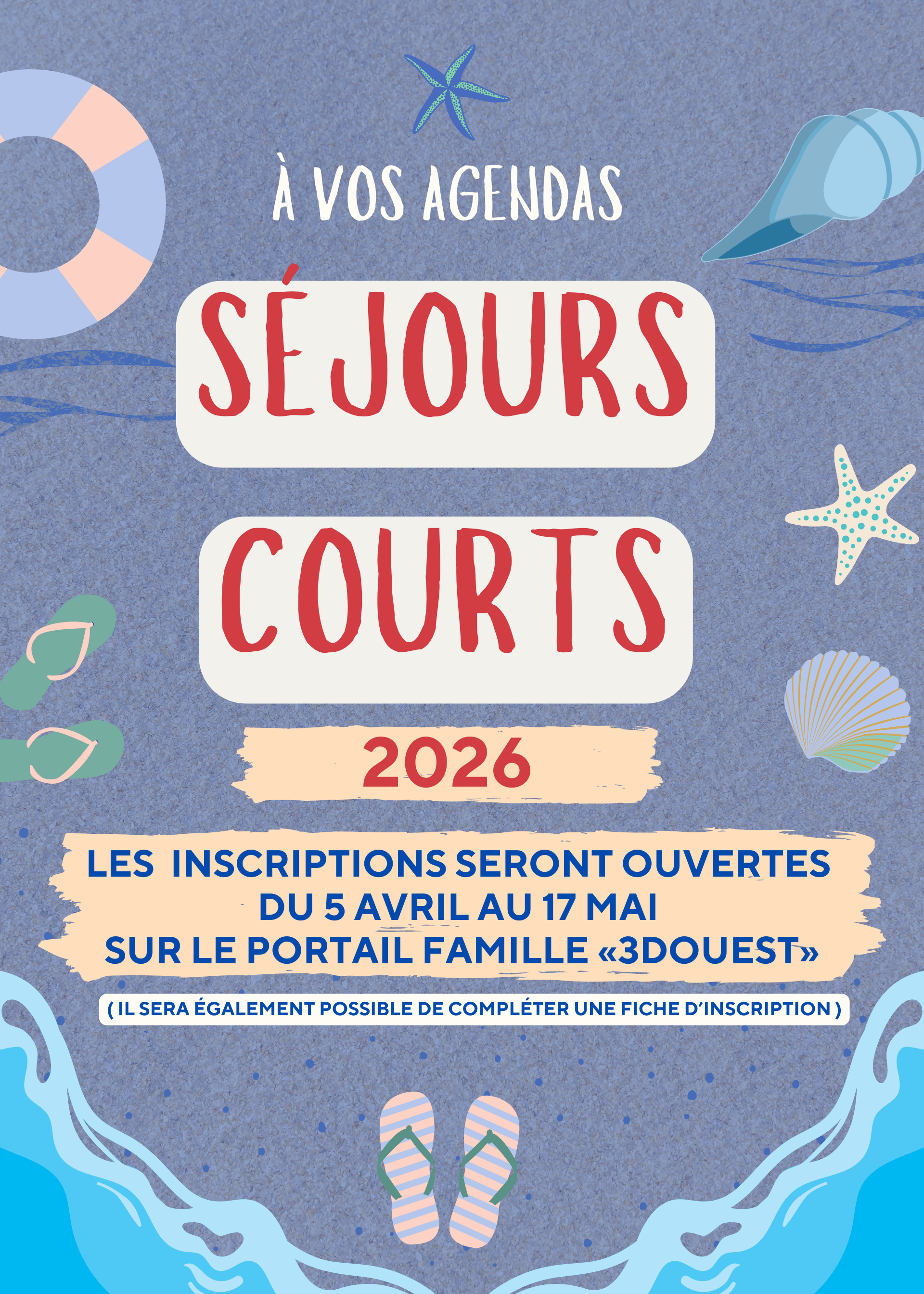 Le planning des séjours courts 2026 proposé par le centre de loisirs est disponible. Des séjours pour tous les goûts et tous les âges : aventure, découverte, activités sportives et moments inoubliables entre copains ! 🏕️ Au programme cet été : Séjour "Trappeur" : du 6 au 10 juillet – pour les 8 à 12 ans Séjour "Les aventuriers de Cherveux" : du 13 au 17 juillet – pour les 6 à 12 ans Séjour "Futuro'sport" : du 17 au 21 août – pour les 8 à 12 ans Inscriptions ouvertes du 5 avril au 17 mai 2026 Sur le portail famille 3DOUEST.