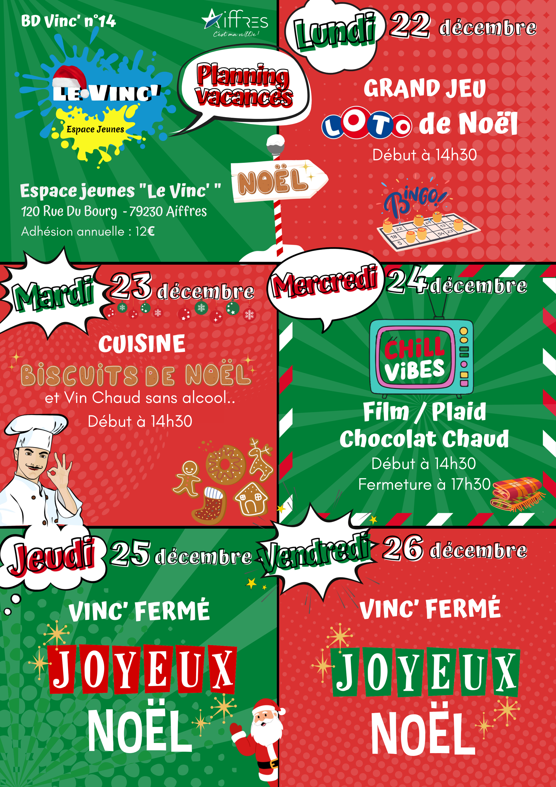 La commune organise des activités pour les prochaines vacances de Noël, du 22 décembre 2025 au 2 janvier 2026 , au centre de loisirs. Les inscriptions sont ouvertes dès maintenant et se font jusqu’au 7 décembre 2025 . Vous pouvez inscrire vos enfants : En ligne via le portail famille : Accéder au Portail Famille En version papier en remplissant la fiche d’inscription : Télécharger la fiche d’inscription Vous pouvez déposer la fiche d'inscription : Au guichet de l'Accueil de loisirs Dans la boite aux lettres de l'Accueil de loisirs (124 rue du Petit Fief - 79230 Aiffres)