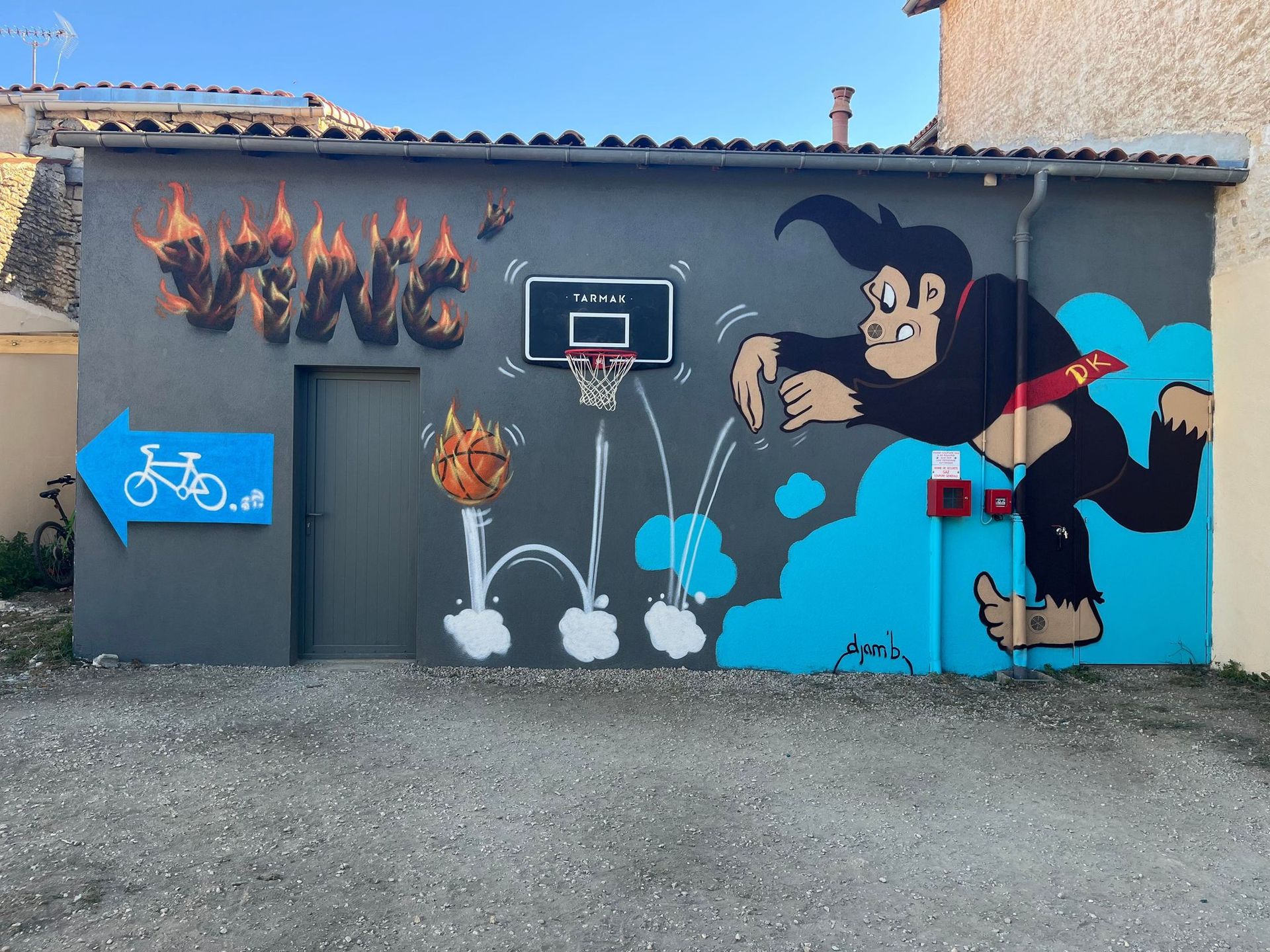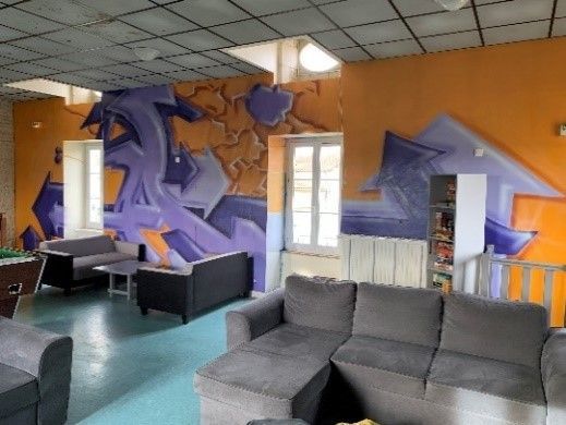Les jeunes ont participé à la rénovation d’un mur du Vinc’ (à l’étage), dont le graff’ datait d’une quinzaine d’années. Pour les accompagner, c’est un enseignant d’arts plastiques, Antoine, qui pratique le graff’, qui a été contacté par l’animateur.