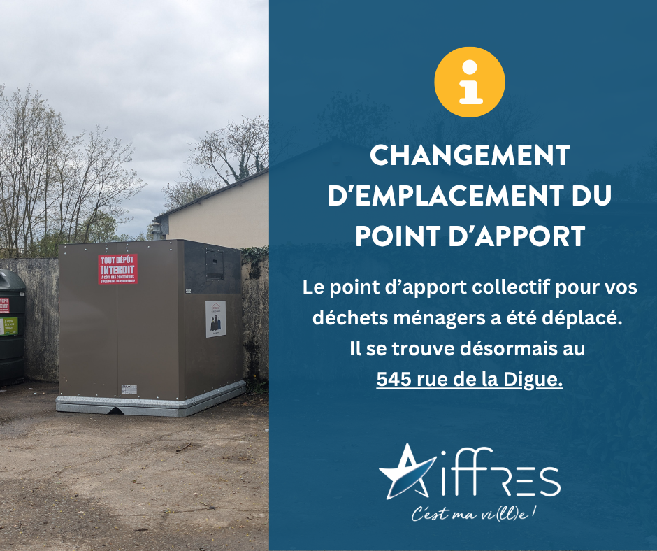 Nous vous informons que le point d’apport collectif pour les ordures ménagères a changé d’emplacement. Il se trouve désormais au 545 rue de la Digue, à proximité de l’entrée des services techniques de la ville. Ce point d’apport vous permet de déposer vos déchets entre deux collectes, dans le cadre du nouveau rythme de collecte (un mardi sur deux). Il contribue à éviter l’accumulation de déchets dans vos poubelles domestiques et les désagréments liés aux sacs débordants, aux odeurs ou aux animaux. Important : le dépôt sauvage est interdit et passible d’une amende. Merci de respecter ce dispositif pour garder notre commune propre et agréable.