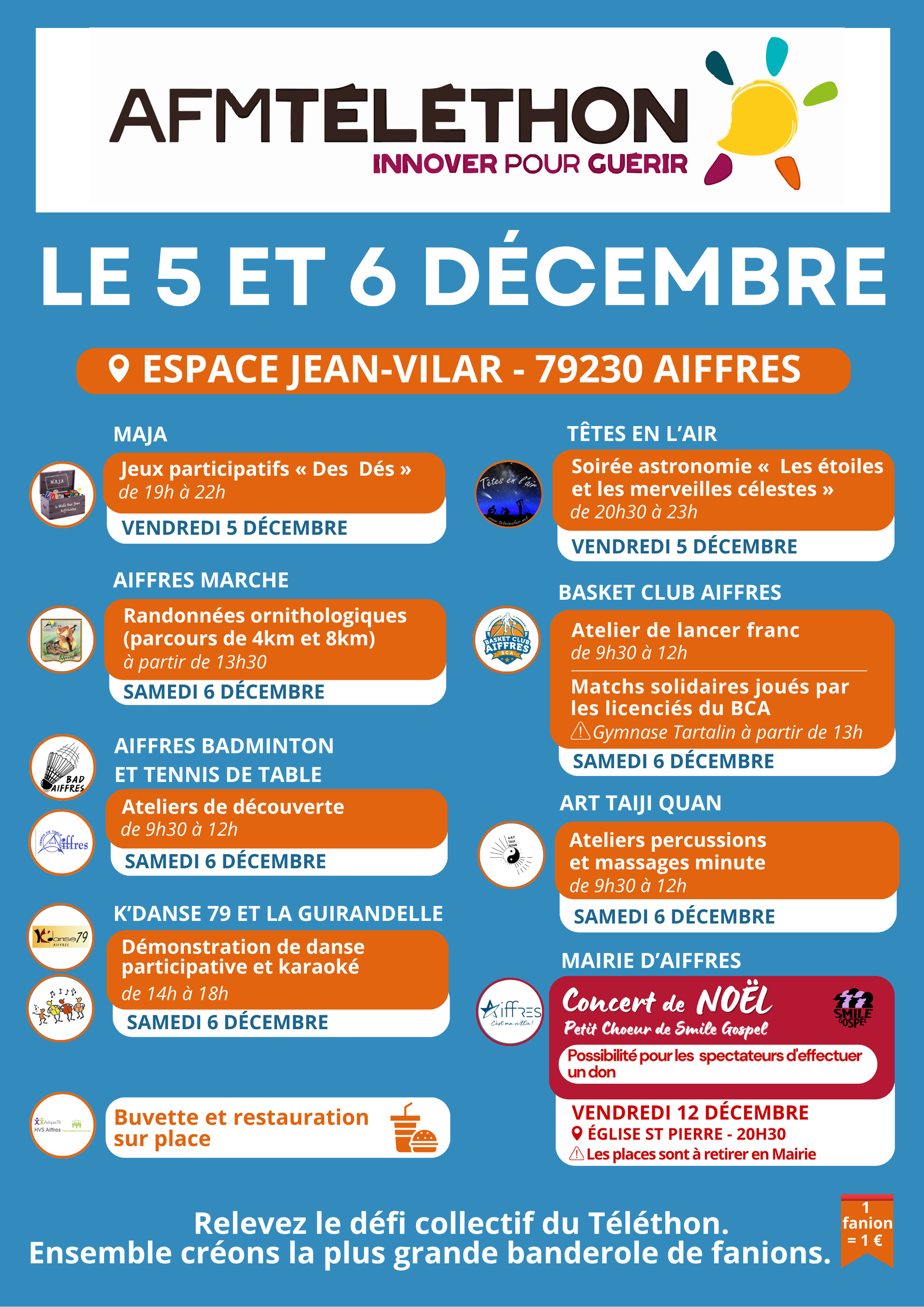 La magie des fêtes revient à Aiffres le samedi 13 décembre, de 10h30 à 18h30, sur la Place Amlamé. Une journée entière placée sous le signe de la convivialité, du partage et de l’émerveillement vous attend ! 🎅 Cet événement est organisé en collaboration avec la Maison Pour Tous Aiffres afin de vous proposer un moment chaleureux et plein de surprises pour toute la famille. 🌟 Un véritable village de Noël prendra vie au cœur du centre-bourg : chalets décorés, artisanat local, douceurs hivernales, idées cadeaux, ambiance féerique… Tout est réuni pour faire briller les yeux des petits comme des grands. 🎨 Animations et activités familiales rythmeront la journée : ateliers, découvertes, rencontres avec les exposants… de quoi ravir petits et grands dans un cadre convivial et festif. 🎅🐴 Les tours en calèche avec le Père Noël seront proposés tout au long de l’après-midi. Un moment convivial pour petits et grands, idéal pour partager la magie des fêtes et capturer de beaux souvenirs en famille ! 🍽️ Restauration et buvette sur place : boissons chaudes, gourmandises, tartiflette, burger et des huitres sur place ou à emporter. 🎆 Point d’orgue de la fête : le feu d’artifice Tartalin à 18h45 ! Un moment magique à ne pas manquer, pour clôturer cette belle journée en beauté. ❄️ Venez flâner, savourer, découvrir, partager et vivre ensemble l’esprit de Noël à Aiffres. Invitez vos proches, partagez l’événement et rejoignez-nous pour célébrer cette période enchantée ! ✨ Nous vous attendons nombreux ! ✨