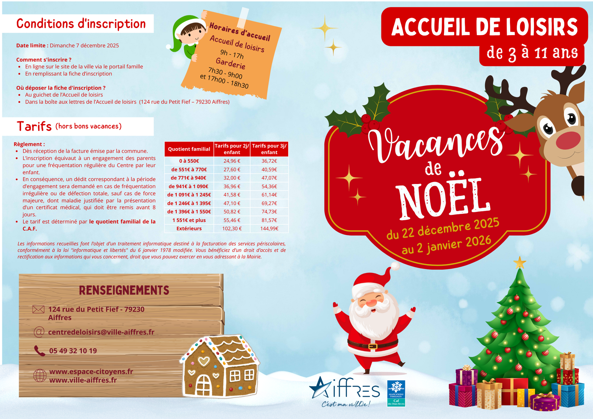 La commune organise des activités pour les prochaines vacances de Noël, du 22 décembre 2025 au 2 janvier 2026 , au centre de loisirs. Les inscriptions sont ouvertes dès maintenant et se font jusqu’au 7 décembre 2025 . Vous pouvez inscrire vos enfants : En ligne via le portail famille : Accéder au Portail Famille En version papier en remplissant la fiche d’inscription : Télécharger la fiche d’inscription Vous pouvez déposer la fiche d'inscription : Au guichet de l'Accueil de loisirs Dans la boite aux lettres de l'Accueil de loisirs (124 rue du Petit Fief - 79230 Aiffres)